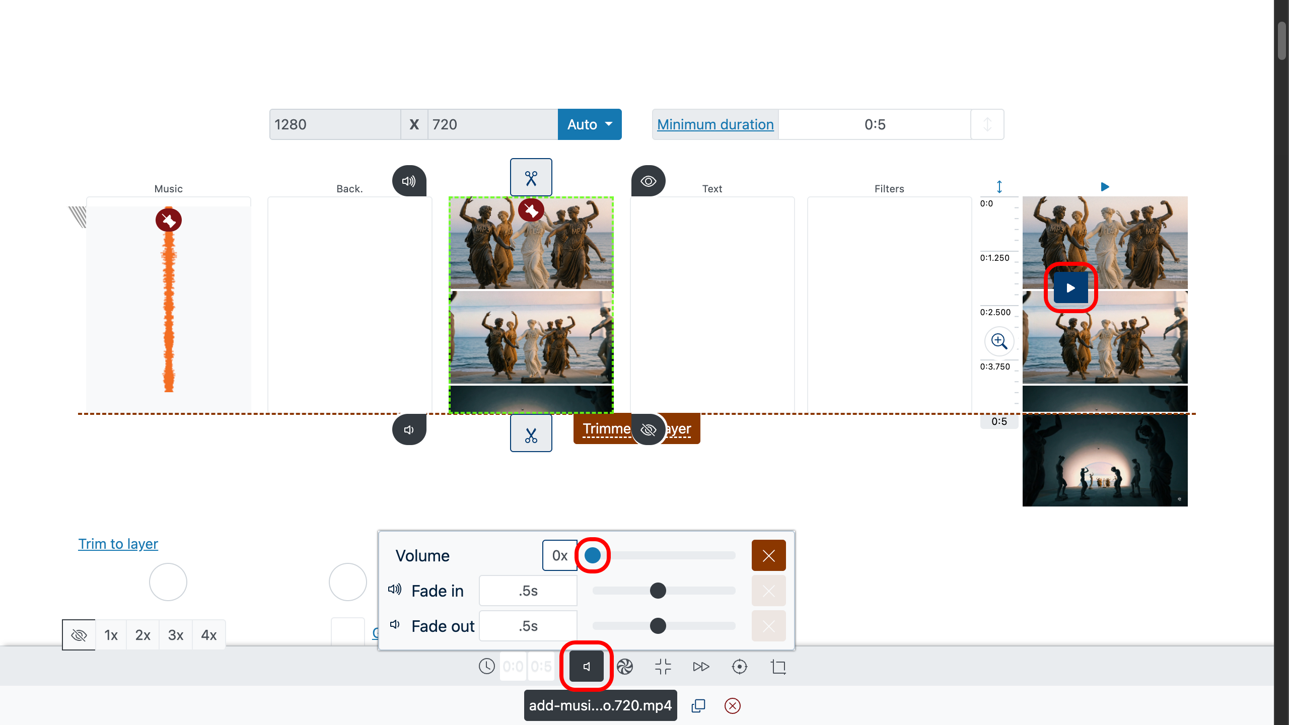 Mükemmel kesim noktalarını bulmak için oynatma başını yerleştirmek üzere zaman çizelgesine ya da önizlemeye çift tıklayın, sonra kontrol çubuğunda tuşuna basın. Şarkının sonunu kovalamak istemiyor musunuz? Bir ana katman seçin (genellikle ana videonuz) ve video düzenleme alanının altında “katmana göre kırp” seçeneğini etkinleştirin. Müzik dâhil diğer tüm dosyalar ona uyum sağlayacaktır.
